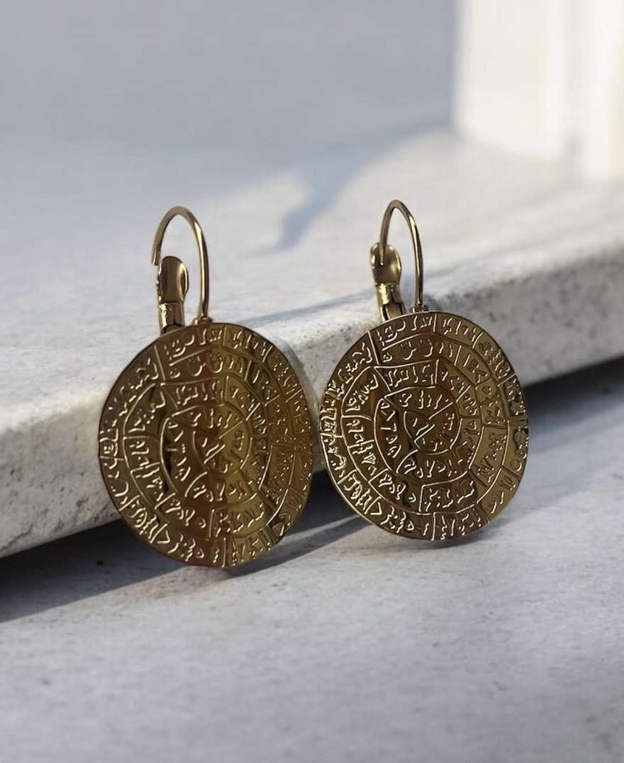 Σκουλαρίκια Φαιστού σε χρυσό, εμπνευσμένα από το διάσημο δίσκο της Φαιστού. Ένα μοναδικό κόσμημα με αρχαιοελληνικό χαρακτήρα που συνδυάζει ιστορία και διαχρονική κομψότητα.